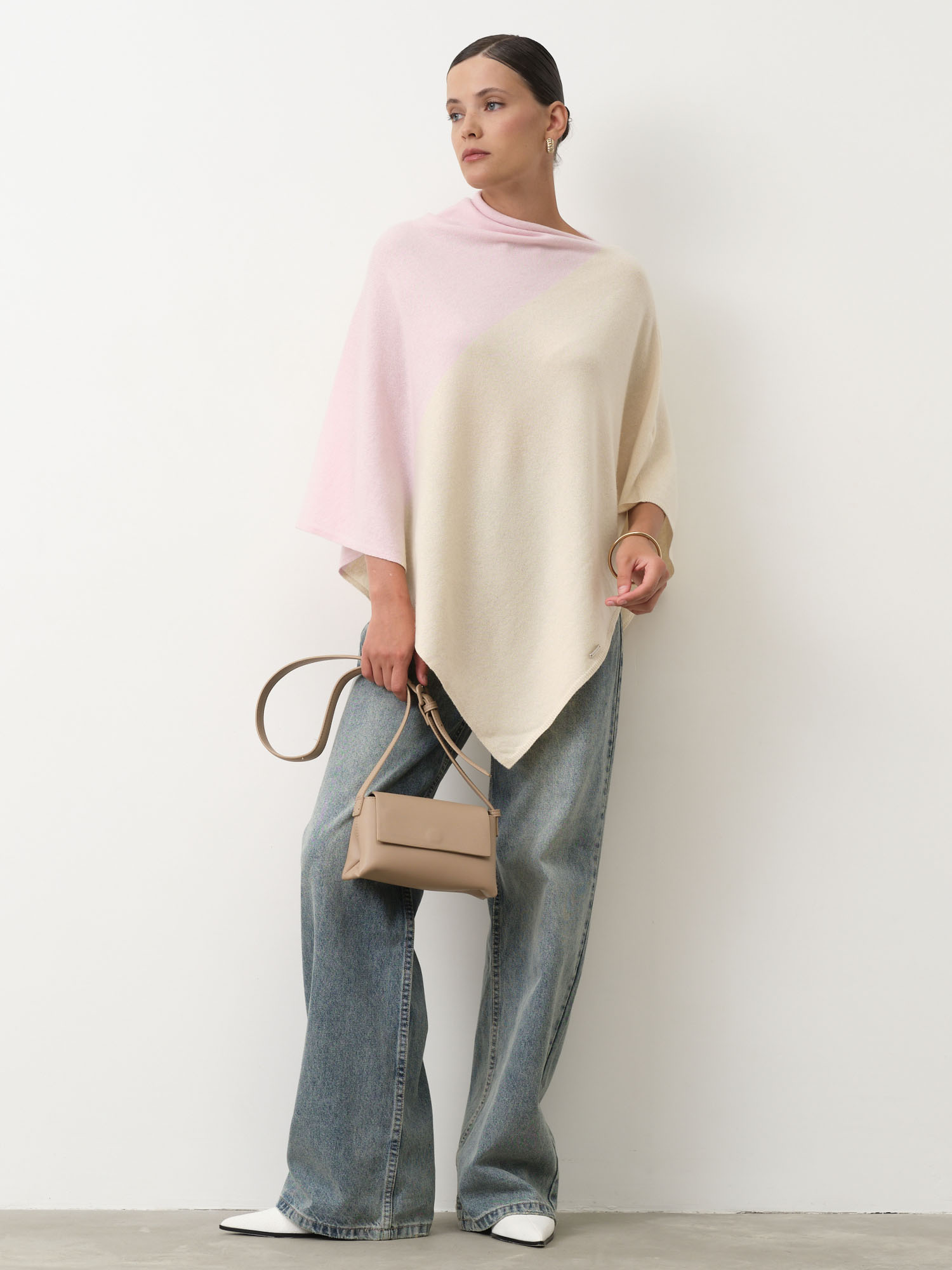 Обожаю это пончо: натуральная шерсть, лёгкость и невероятное тепло. Асимметрия смотрится стильно, а кремово-розовый тон добавляет нежность.