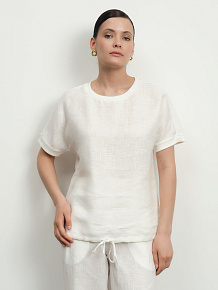 Свободный прямой силуэт с короткими рукавами и округлым вырезом. Лаконичный крой подчеркивает современный и сдержанный стиль.