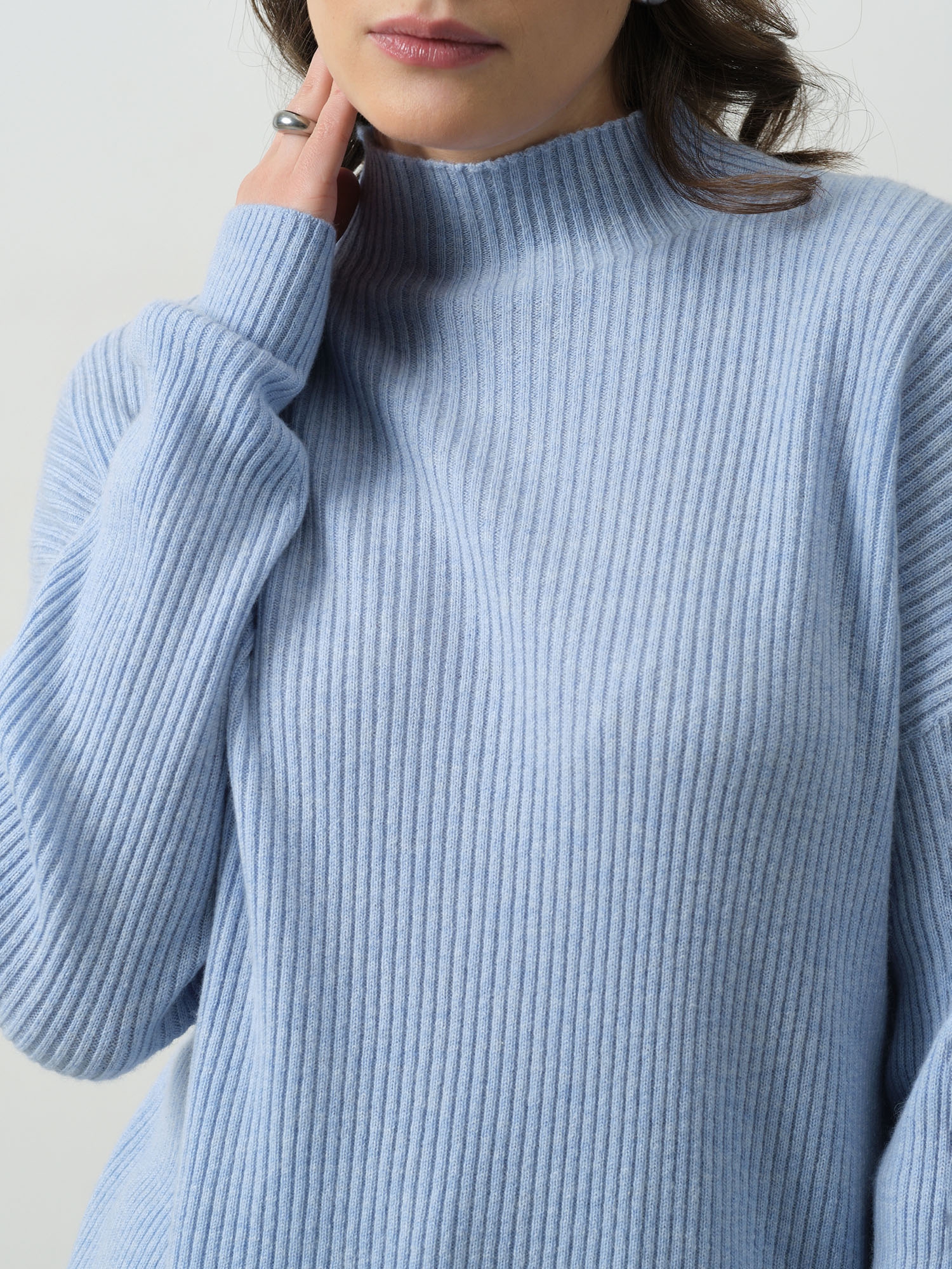 Очень приятный свитер нежно голубого цвета. Но мне показался коротковат. Не хватает как будто нескольких сантиметров. Хотя в остальном размеры нормальные. И рукава, и горло, и обхват в целом. Тактильно не к чему придраться. Кашемир есть кашемир.
